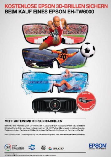 Meerbusch, 2. Mai 2012 – 3D-Heimkino ist am Schönsten, wenn man Filme oder Live-Übertragungen gemeinsam mit Freunden oder Familie genießen kann. Kunden, die sich für einen Epson EH-TW6000 entscheiden, erhalten im Mai und Juni 2012 zwei 3D-Active Shutter-Brillen gratis dazu. Zusammen mit der Brille, die dem Gerät bereits beiliegt, verspricht das Angebot perfekten 3D-Heimkinogenuß zu Dritt. Die Aktion läuft vom 1. Mai bis zum 30. Juni 2012. Die beiden gratis 3D-Active-Shutterbrillen haben einen Gegenwert 158,00 Euro (UVP).
