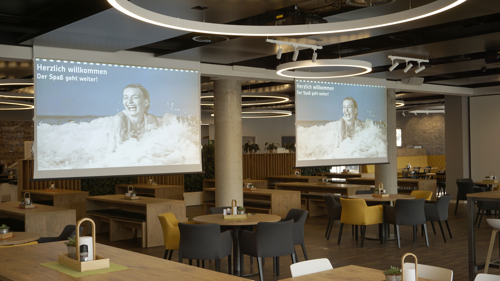 „Eine besondere Herausforderung bei der Installation der Projektoren war die Decke des Kasinos", fährt Mrugowski fort. „Wir hatten zwar beim Entwurf des Raumes bestimmte Positionen für die Geräte vorgesehen, mussten diese aber im Zuge der Einrichtung wiederholt ändern. Die Expertise unseres Dienstleisters hat in Verbindung mit den verfügbaren Optiken für die beiden Epson Beamer das Problem schnell gelöst. Wir sind von den Epson Laserprojektoren überzeugt und haben mit ihnen eine gute Wahl getroffen."